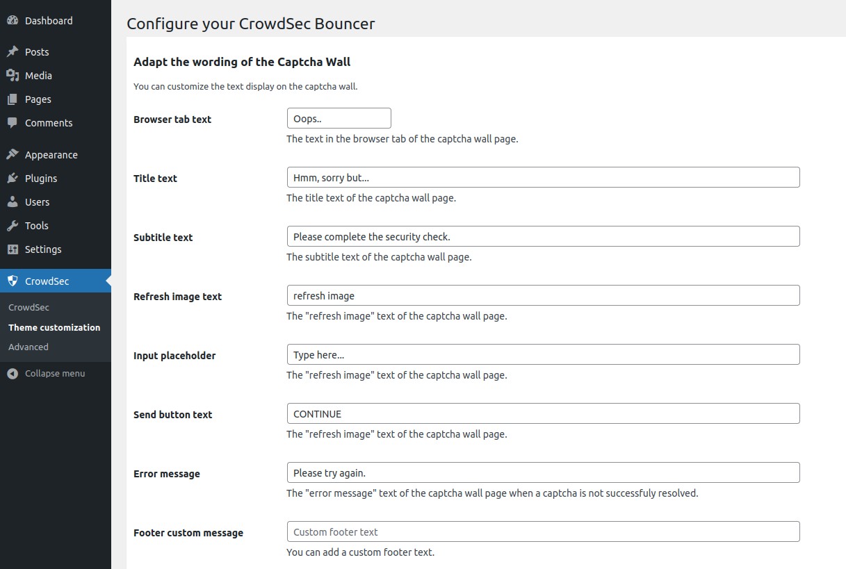 These configurations are divided in three main parts : CrowdSec, Theme customization and Advanced.