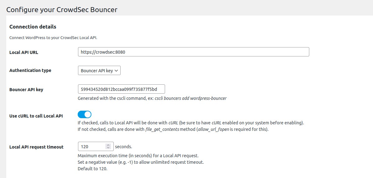 Please note that first and foremost CrowdSec must be installed on a server that is accessible via the WordPress site.