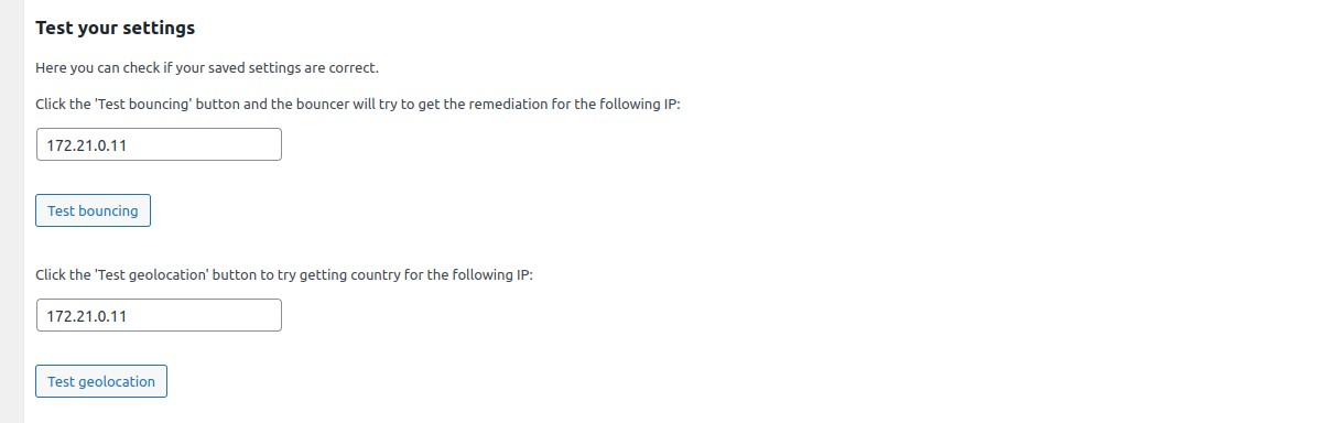 Click the "Test bouncing" button and the configured bouncer will try to get the remediation (bypass, captcha or ban) for the IP entered in the text field. By default, tested IP is the current detected remote IP.